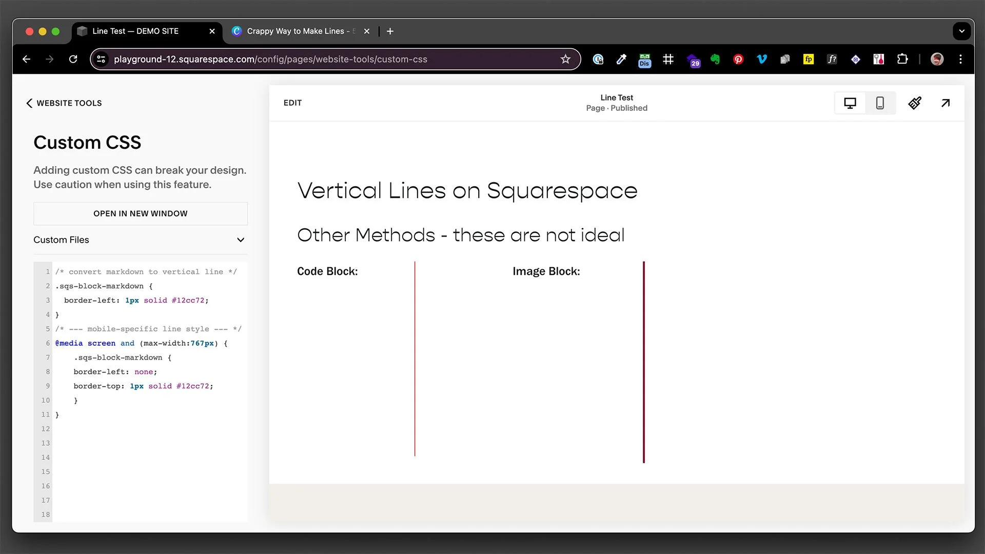 Why Code Blocks and Image Blocks are not a good way to make vertical lines in Squarespace